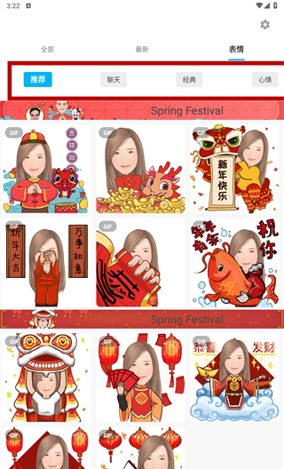 3、在表情中还可以滑动找到不同类型的表情包,一键制作。