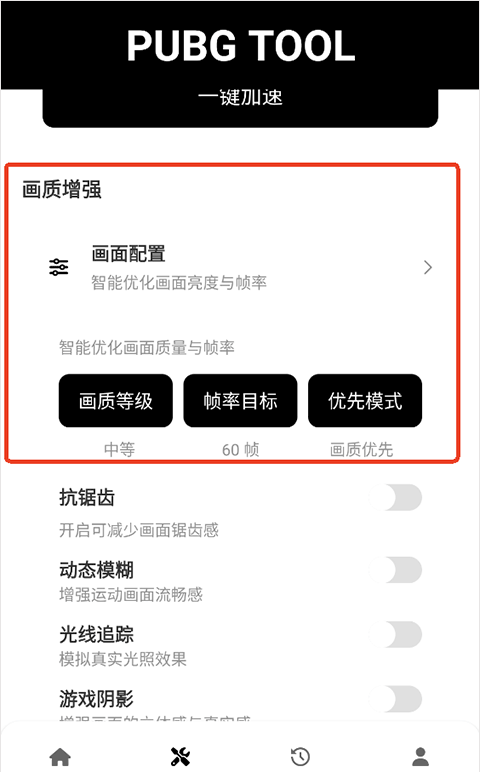 3、下滑找到画质增强这一栏,点击画面配置会出来画质等级、帧率目标和优先模式。