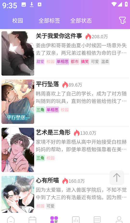 2、点击下方“分类”,可通过标签与状态查找喜欢的漫画。