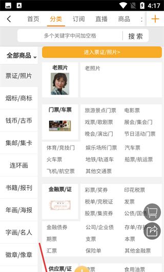 2、分类板块有票证、照片等分类,展示老照片等细分品类,方便查找收藏品类,底部有功能栏。
