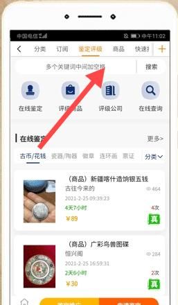 2、进入搜索界面,提示多个关键词中间加空格,助力用户精准查找心仪藏品,无论是古币、徽章还是连环画等都能一网打尽。