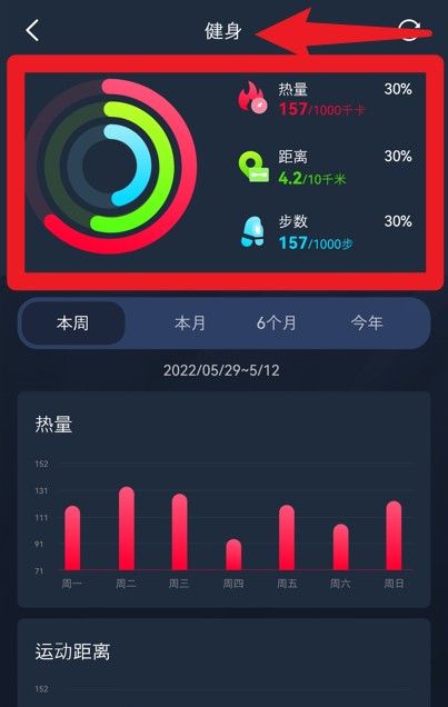 3、健身页面整合了卡路里、距离和步数目标,并配以彩色进度圈和条形图,让锻炼数据一目了然。