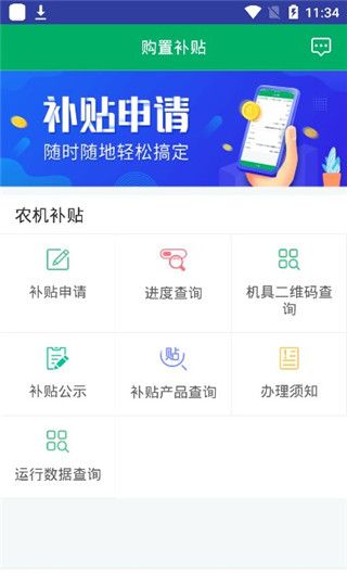 1、打开从本网站下载的最新版《河北农机补贴》,进入软件首页,在购买补贴页面,可以看到有补贴申请、进度查询、机械二维码查询、补贴产品查询等。
