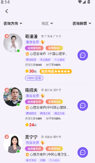 2、在选择页面上,首先要明确咨询方向。睡眠障碍、亲子教育、情绪压力等具体领域都可以作为参考。这有助于更准确地筛选出合适的导师。