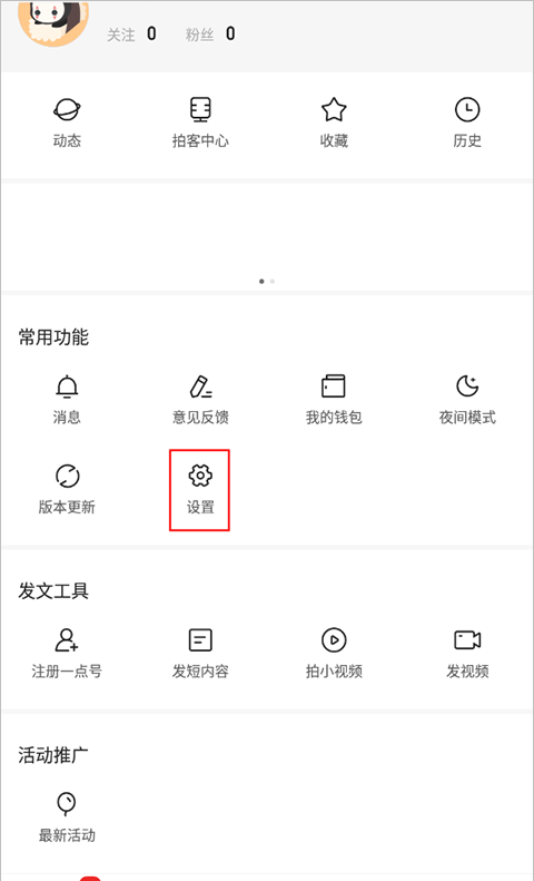 1、转到我的页面,单击“常用功能”下的“设置”。
