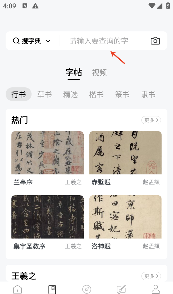 1、打开软件后,在资源页面上搜索所需的书法。