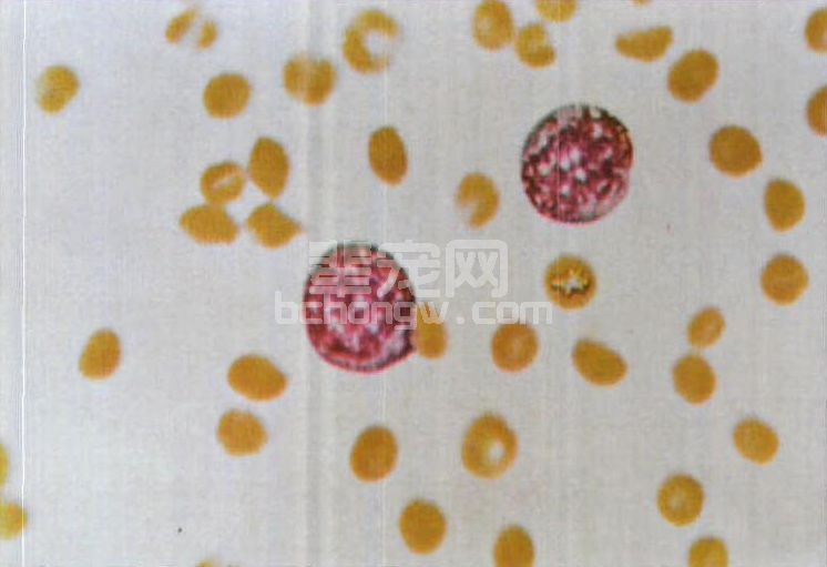 图4-4 犬传染性肝炎淋巴细胞像(具有染色质颗粒的2个浓染的淋巴细胞,血小板消失)