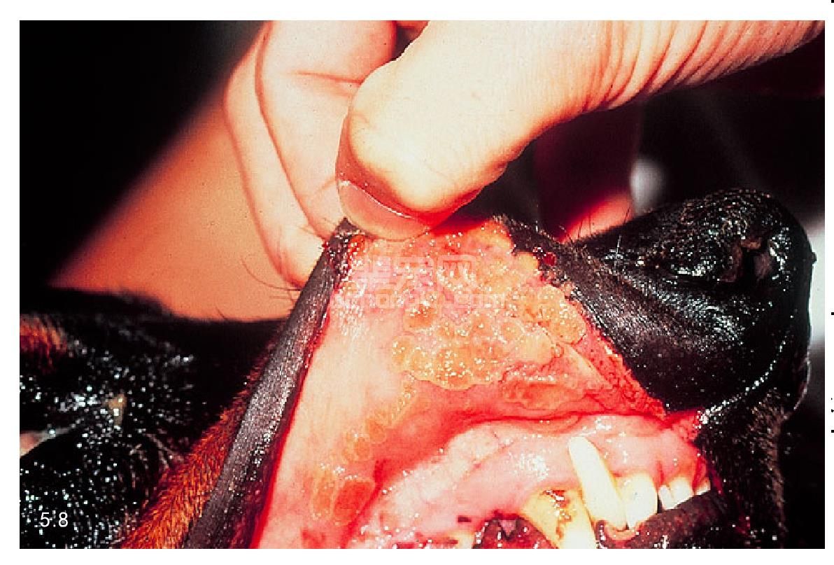 图5.8 慢性肾衰竭患犬的口腔黏膜溃疡。