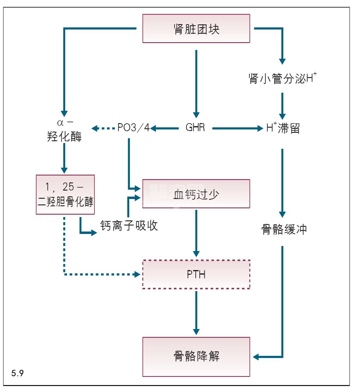 图5.9 慢性肾衰竭病例中肾脏继发甲状旁腺功能亢进的发病机制,肾脏产生的钙三醇能正常抑制PTH产生和副甲状腺释放。虚线表示抑制作用。