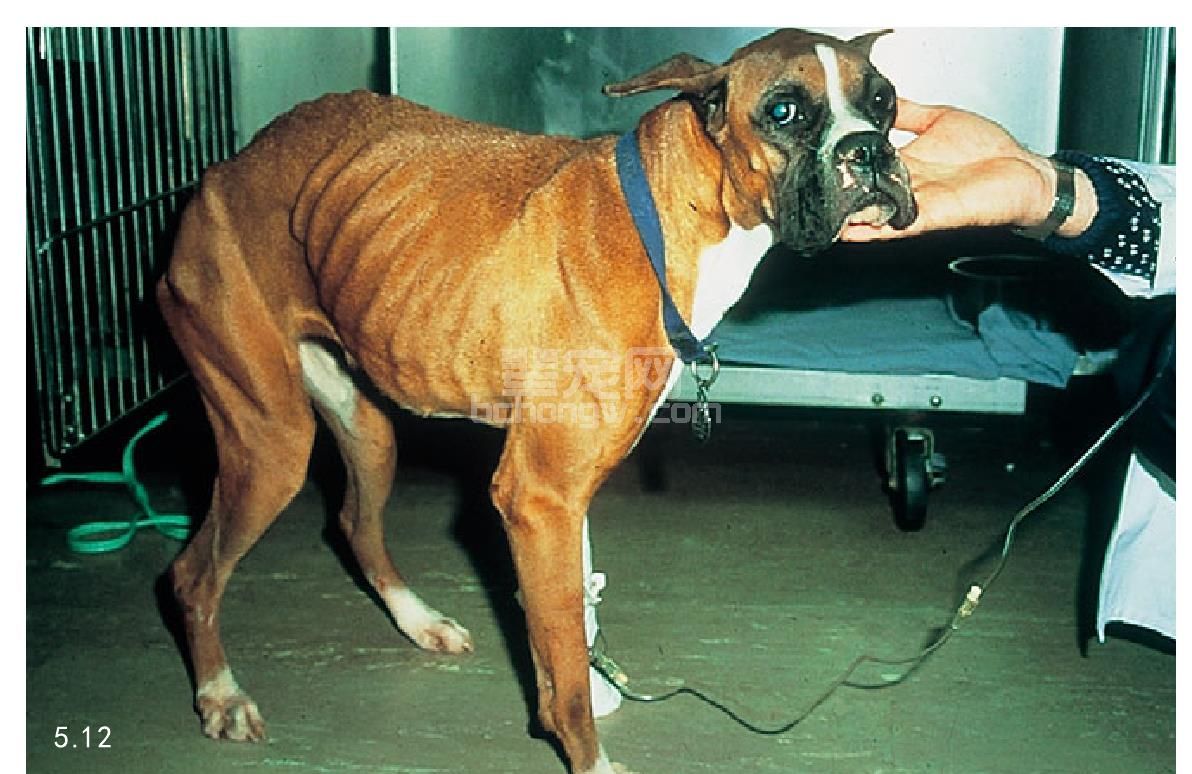 临床症状 患有CRF的动物都有食欲降低、体重减轻、被毛粗糙的表现(图5.12)。许多患病动物烦渴和尿液增加,并在晚上强迫排尿。晚期病例,常见呕吐,并有黑粪。活动的耐受性降低,神经症状包括精神沉郁、虚弱、抽搐、震颤、摇头和癫痫发作等。