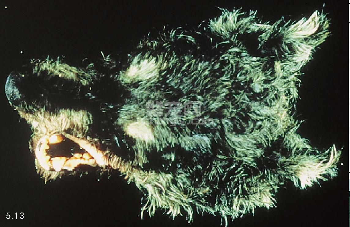 进行身体检查时,多数患病动物出现体温过低并有“尿毒症气味”口臭。出现氮质血症,触诊口腔黏膜,一般会发现有潜在的溃疡。病程长久其下颌极具弹性(橡皮颌),这种情况并不常见(图5.13)。对于年轻的犬,其下颌和上颌骨可能会出现肿胀及牙齿松动(图5.14)。触诊肾脏异常,小、硬、多块状、大等。高血压多见。