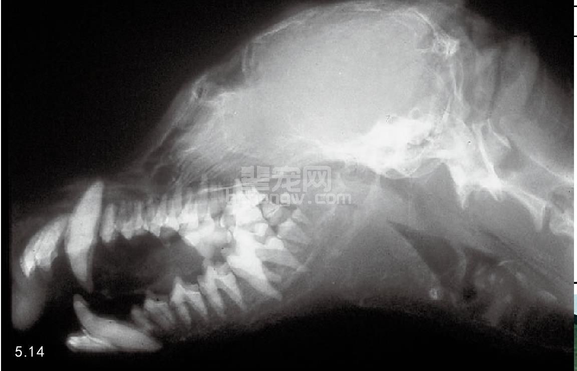 图5.14 放射学检查图5.12犬的骨骼显示骨密度很低。