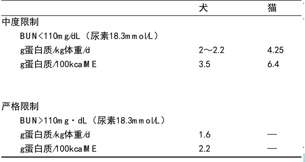 限制蛋白 患有CRF的犬调节蛋白的摄入量,目的是使血液尿素氮(BUN)水平保持在小于80mg/dL(尿素13.3mmol/L)。低蛋白日粮会使患有CRF的犬看起来更强壮、更有活力,被毛更健康。另外,尿量下降,因为尿毒症犬倾向于异化代谢状态,日粮蛋白需求至少稍高于正常犬。患有CRF的犬不能够耐受蛋白质低于2.2g/(kg·d),猫的最低限量是4.25g/(kg·d)(表5.8)。患有CRF犬的日粮蛋白质过少,有报道认为会出现低血清蛋白血症、贫血症和代谢性酸中毒,最好定期检查这些指标。