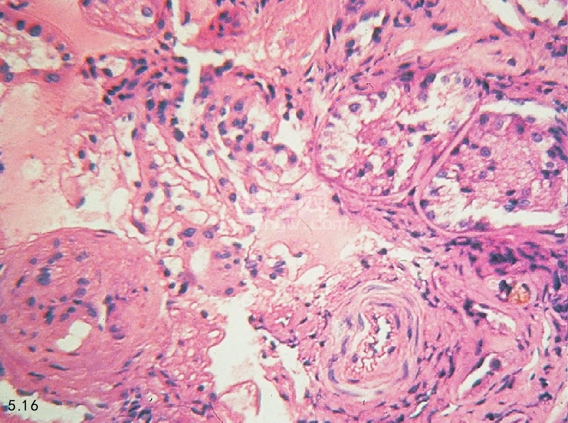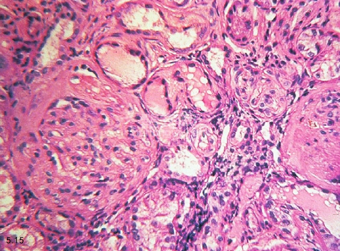 图5.15和图5.16 犬慢性肾衰竭肾脏的组织病理学。图5.15肾血管球硬化症和单核性间隙性渗透病变。图5.16肾小管萎缩和间隙纤维化。
