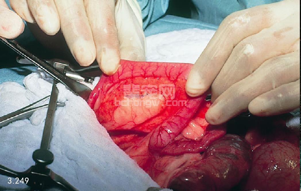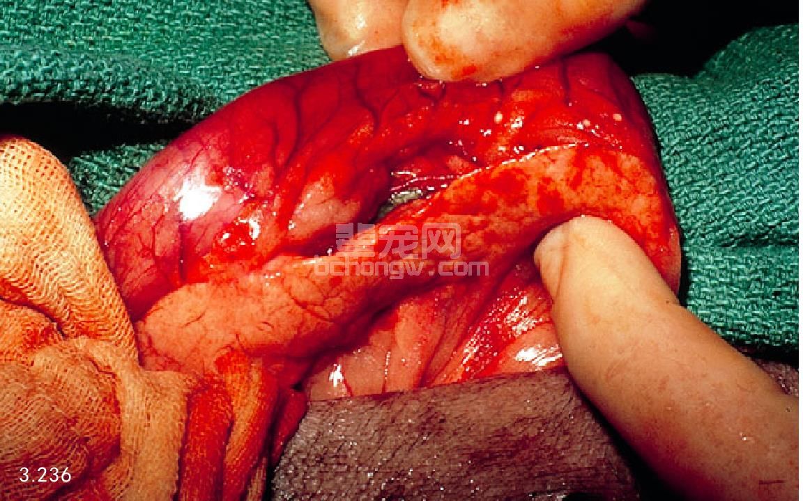 图3.236 7岁雄性贵宾犬持续性呕吐,药物治疗5~7天后,手术显示水肿的胰腺炎。