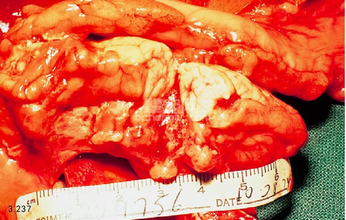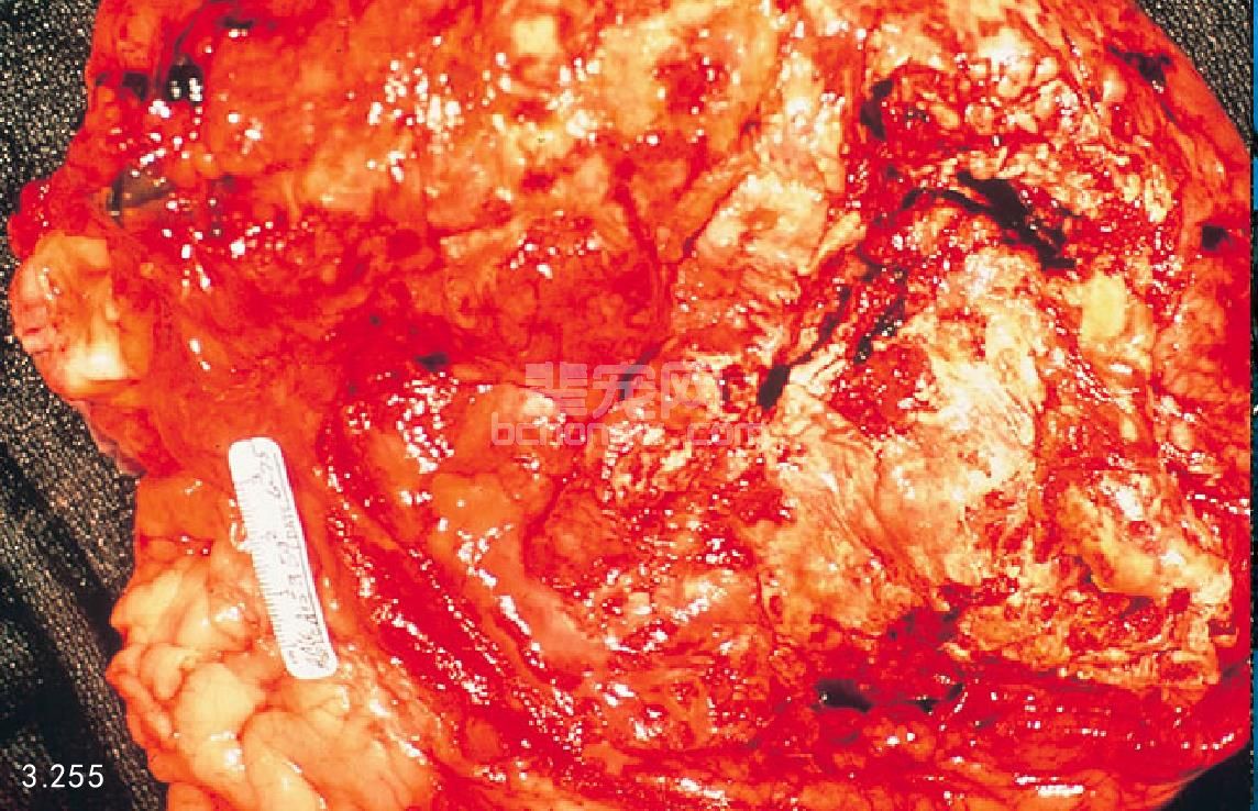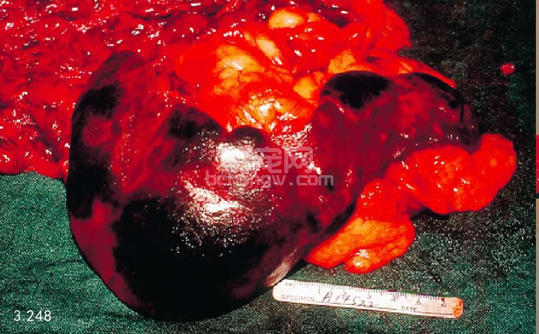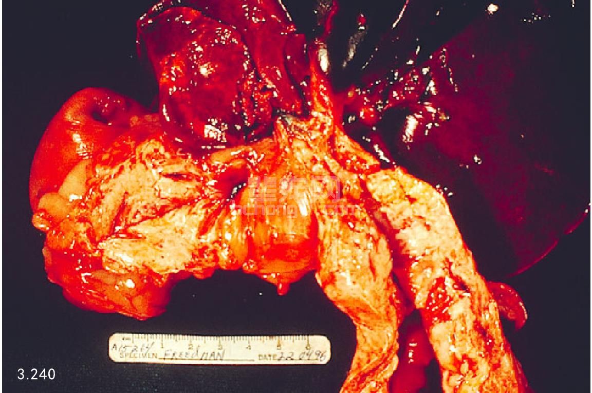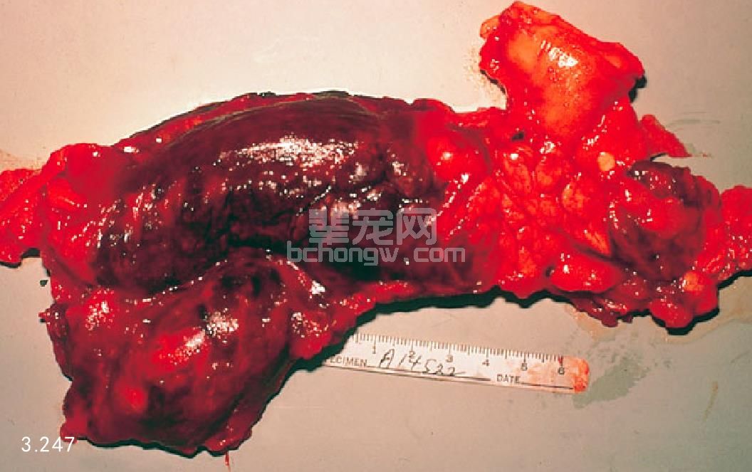 图3.247 图3.246病例明显的胰腺坏死,胰腺周围淋巴结由于出血坏死而明显增大。
