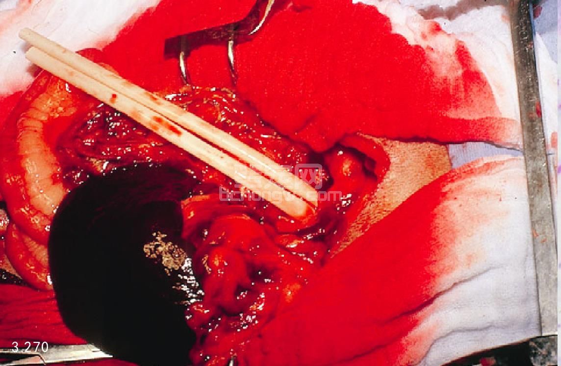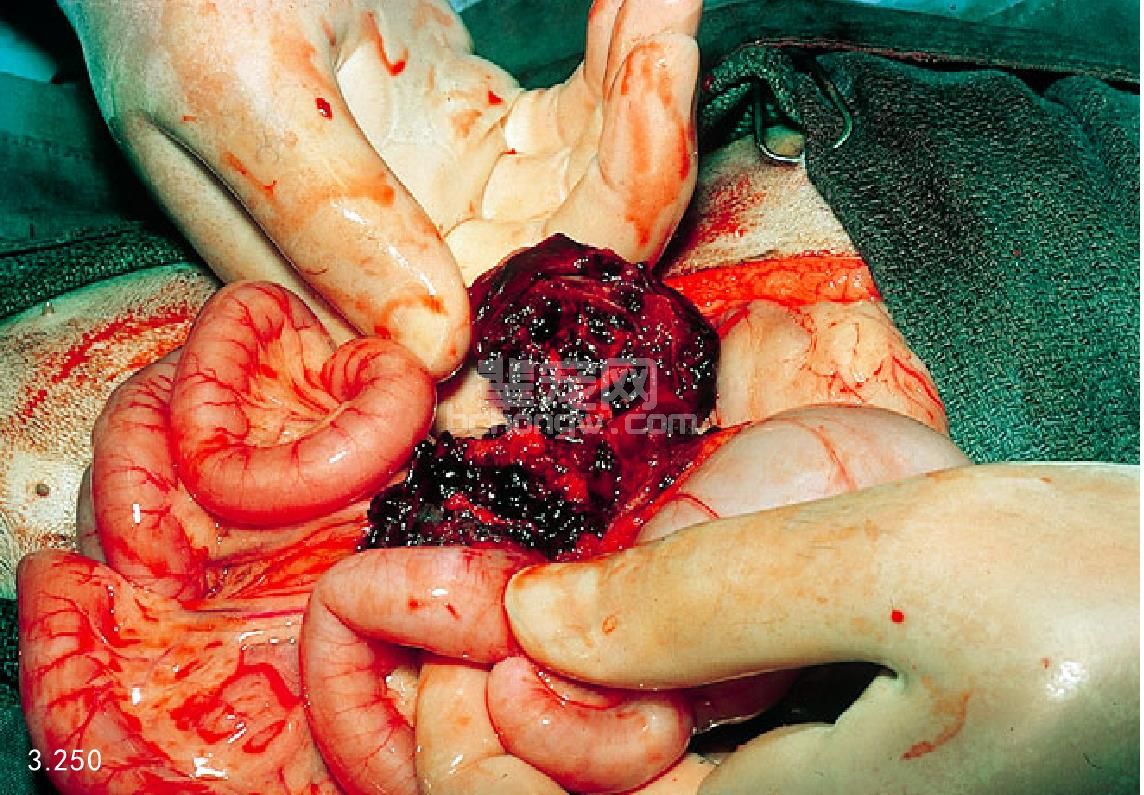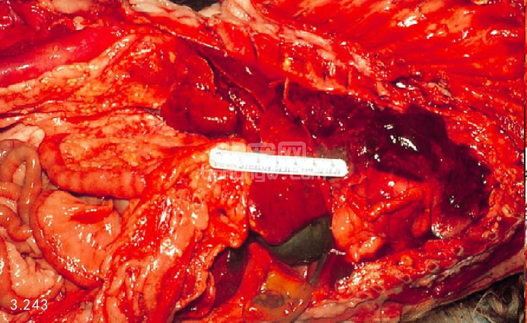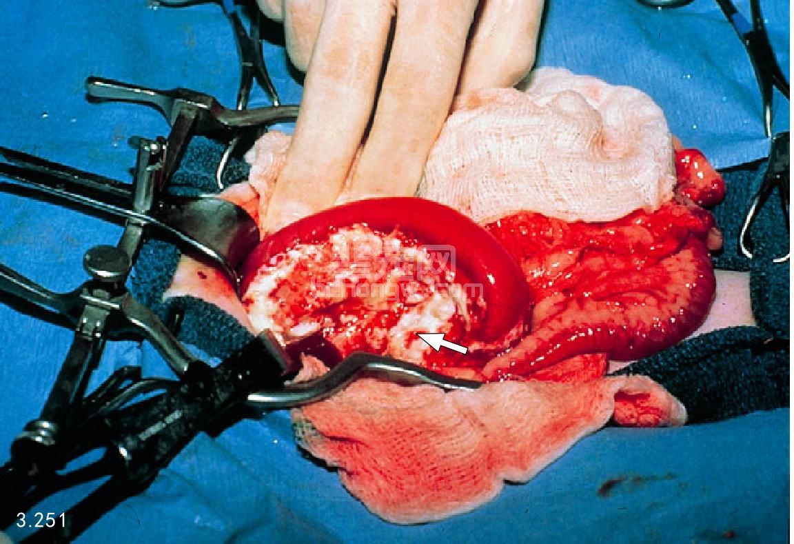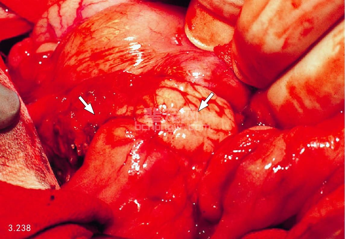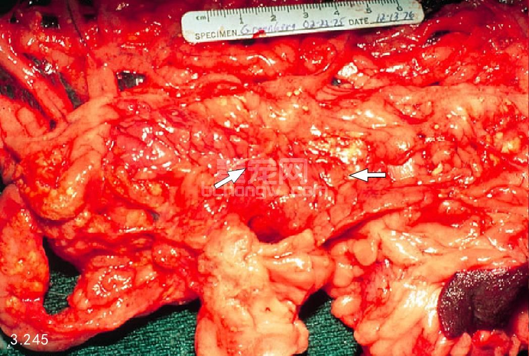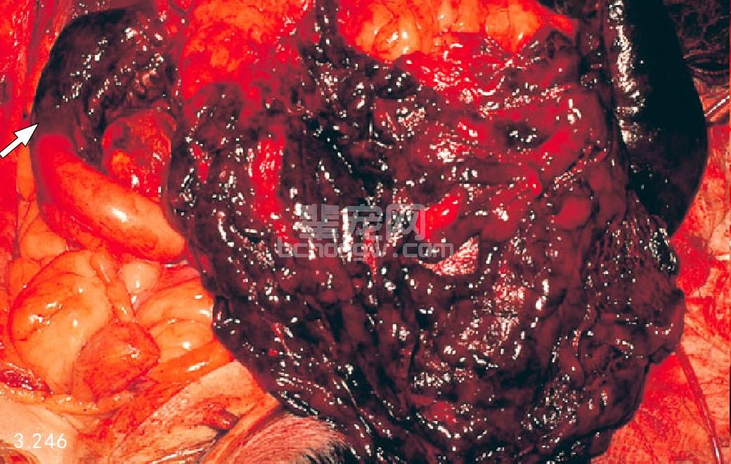 图3.246 死后剖检发现严重出血性胰腺炎,伴发十二指肠病理性凝血(箭头所指)和网膜梗死。