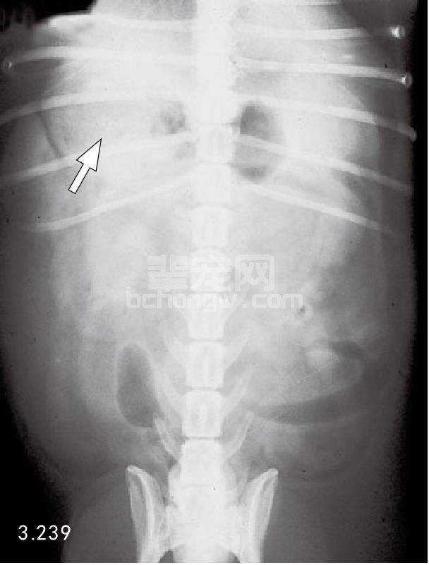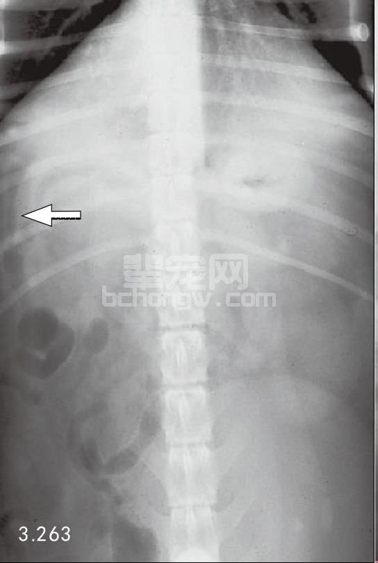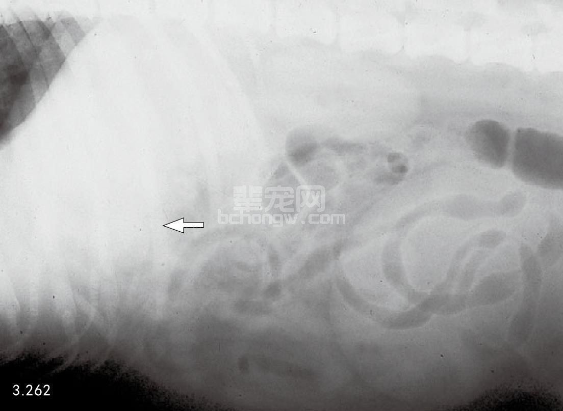 图3.239 图3.238的犬X线拍片检查是典型的急性胰腺炎,显现出右上腹部扇形液体密度增加(箭头所指),十二指肠向一侧移位。