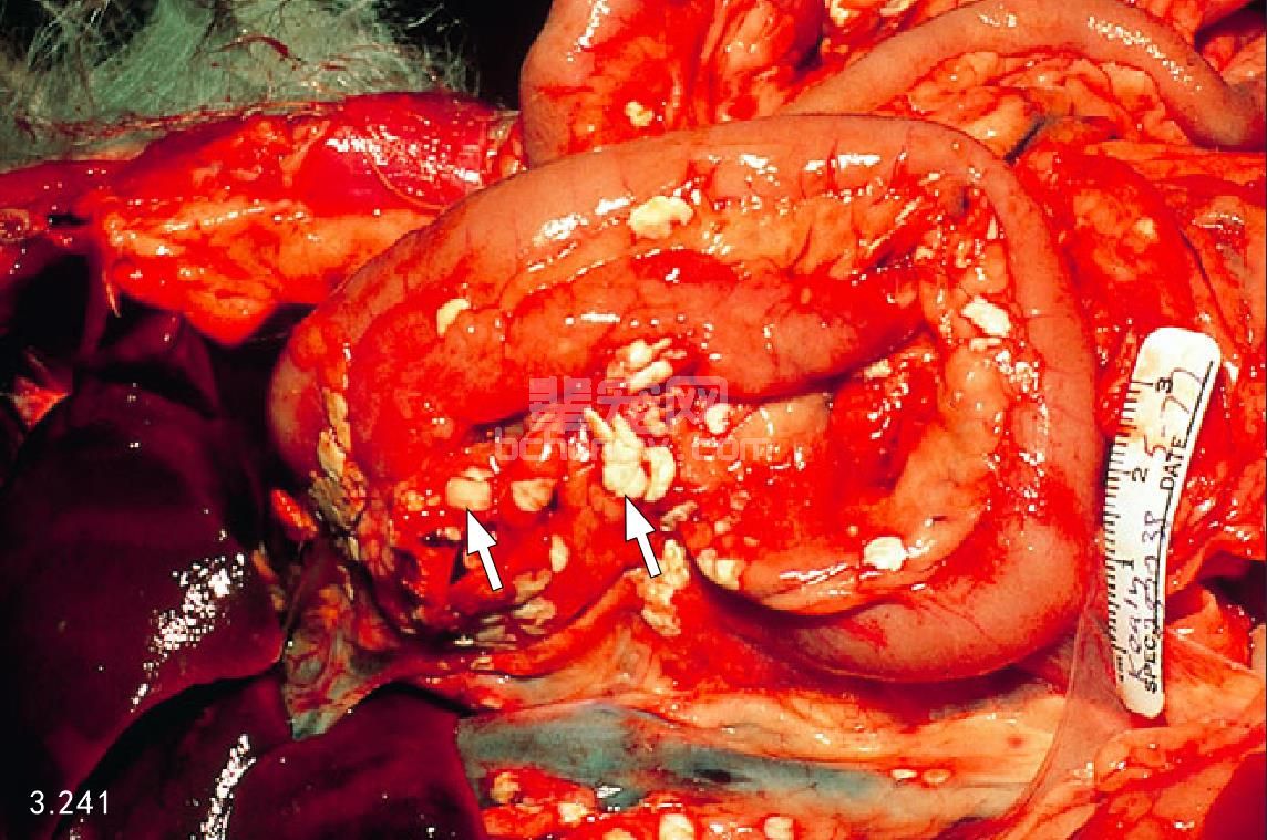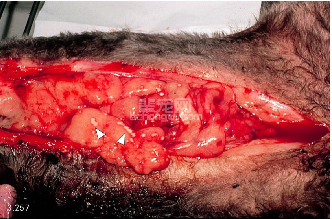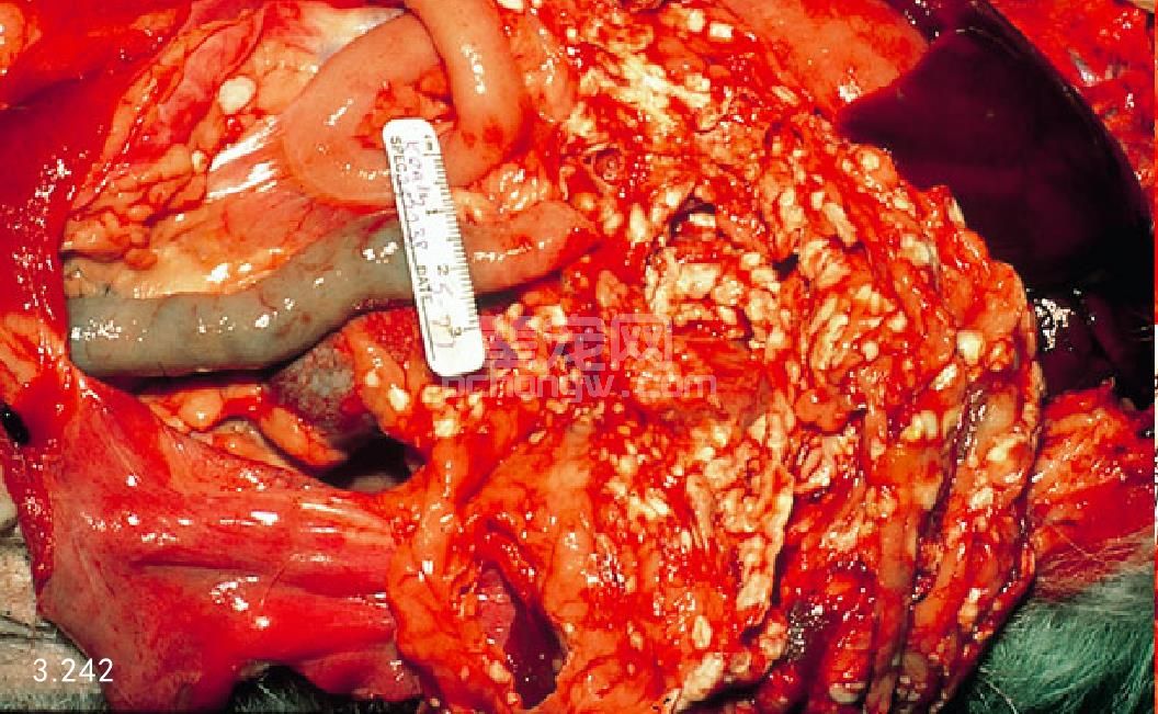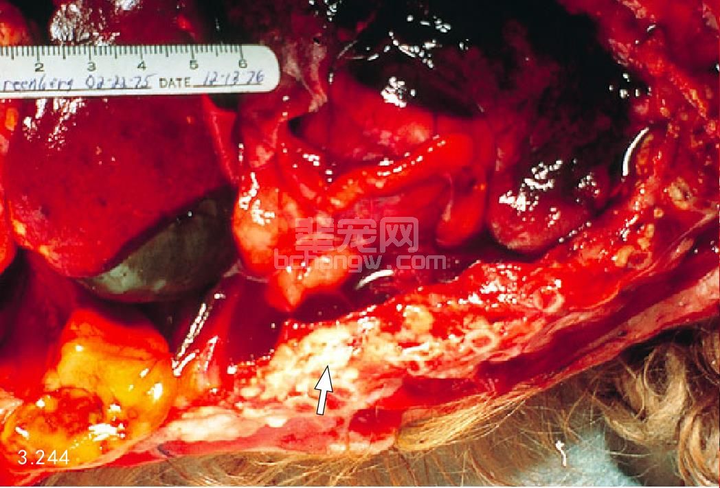 图3.241 13岁雌性拉萨犬死后剖检腹部显示有弥漫性水肿性胰腺炎,并伴发整个肠系膜和网膜的钙化灶沉积(箭头所指)。