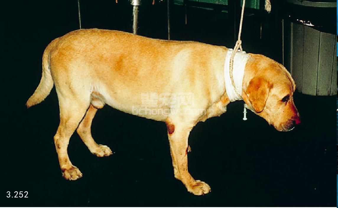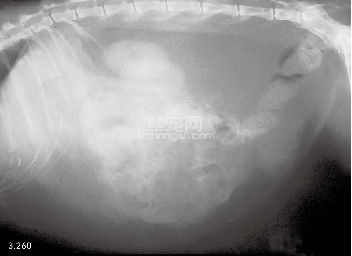 图3.252 5岁雄性拉布拉多猎犬有呕吐、精神沉郁和腹痛表现。