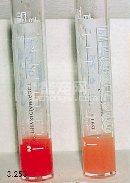 图3.253 从图3.252患犬开始采得的血样有明显的高脂血症,尽管经多方尽力医治,但最终仍死亡。
