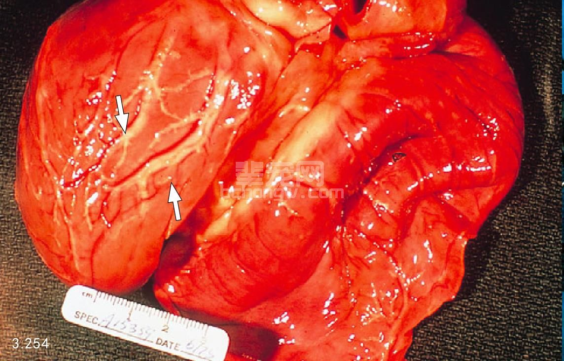 图3.254 图3.252中的患犬死后剖检:显示弥漫性甲状腺萎缩,有严重的动脉粥样硬化血管损伤,包括冠状动脉(箭头所指)。