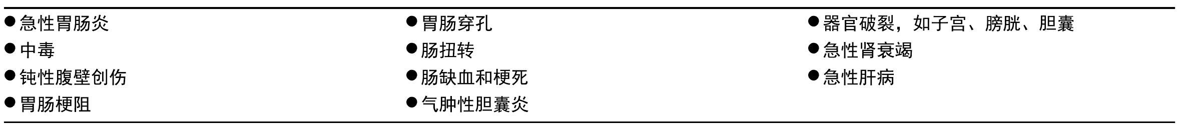 鉴别诊断 急性胰腺炎初期的鉴别诊断要与多种临床疾病鉴别(表3.22),表中广泛列出了任何有急性腹腔综合征相似症状的疾病。有几个是外科急诊,需要快速诊断和治疗。