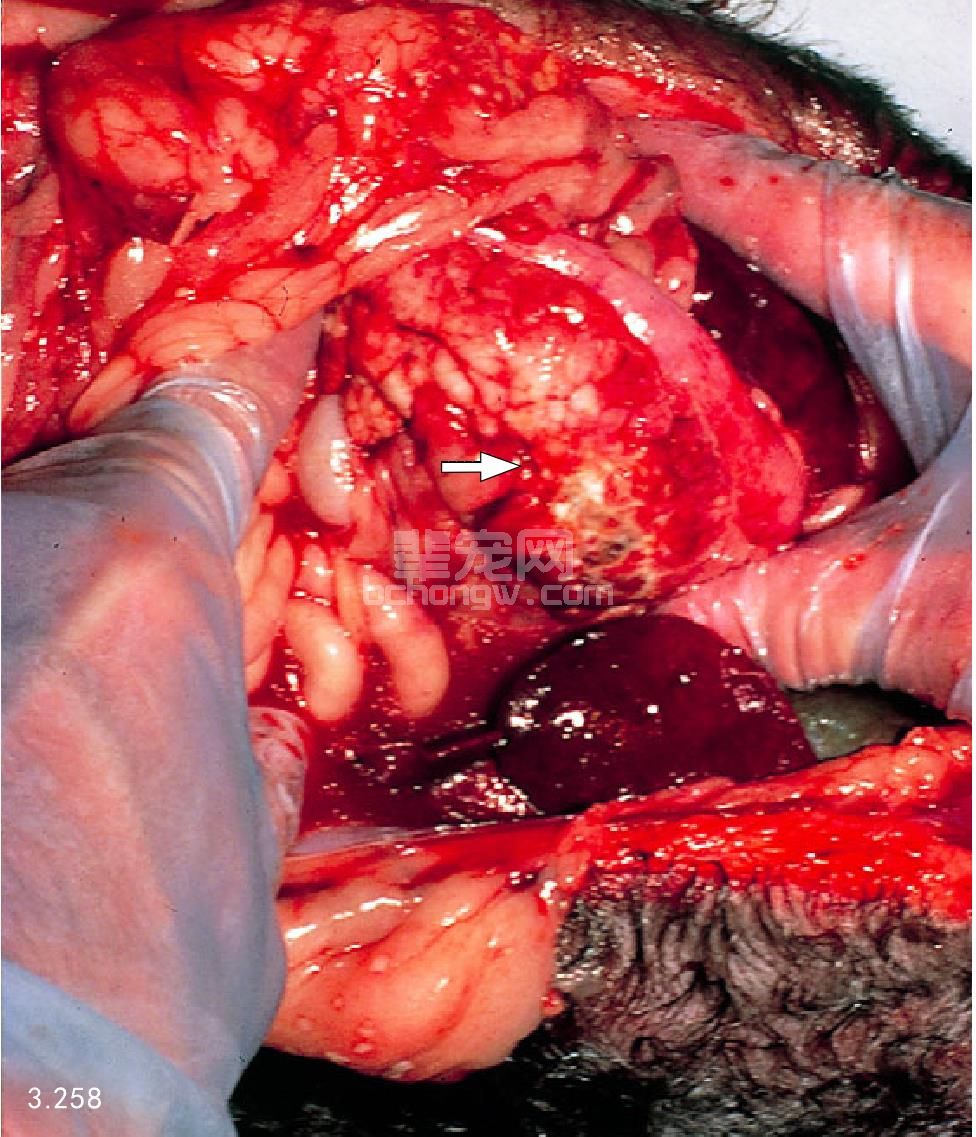 图3.258 图3.256中的犬死后剖检有严重的出血性胰腺坏死(箭头所指)。
