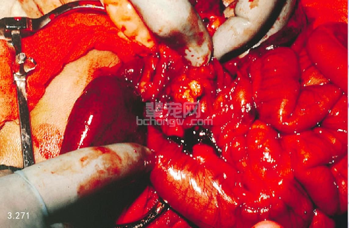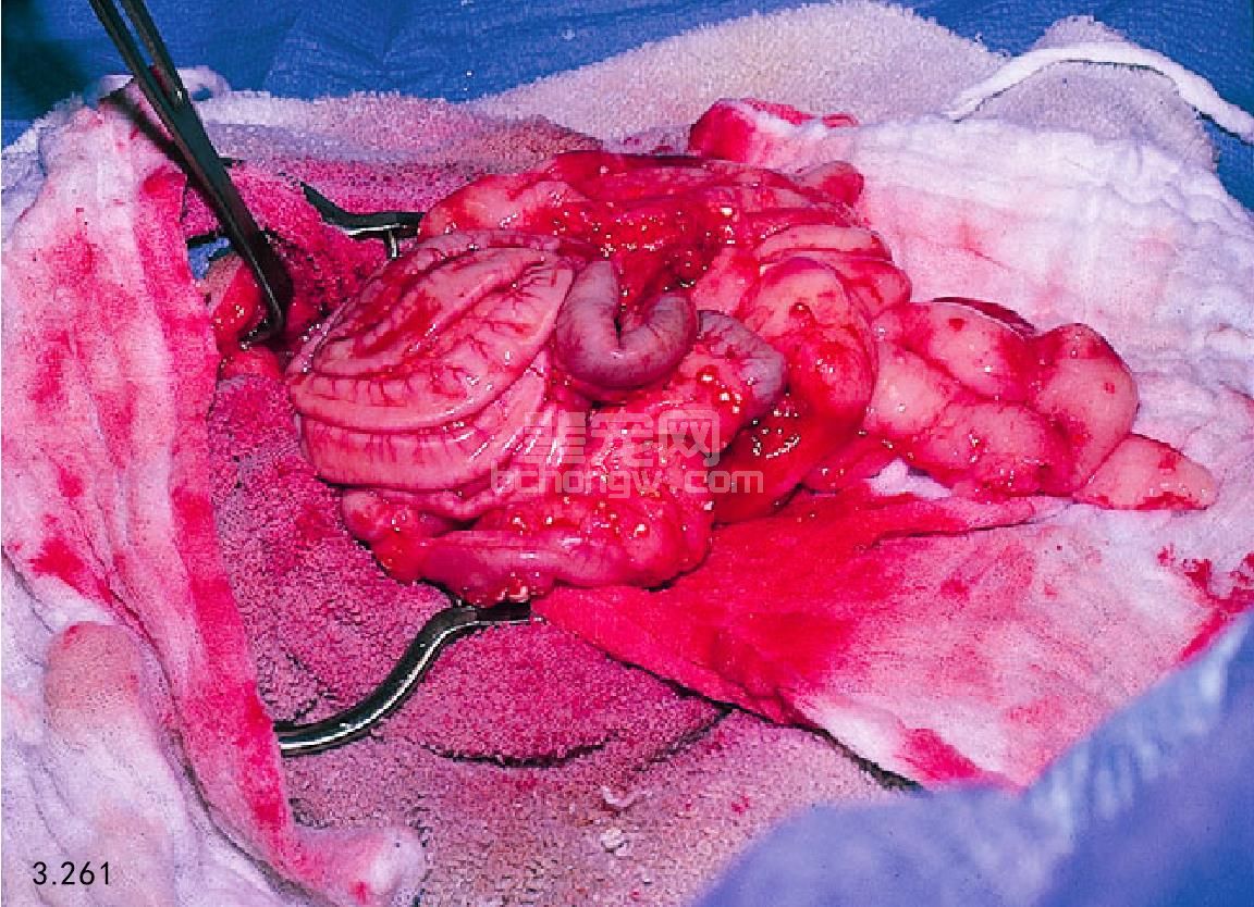 图3.272 7岁雄性硬毛猎狐 患有出血性胰腺炎,手术中它与腹腔内炎症组织几乎难以区分。肠系膜根部有一个大脓肿腔。
