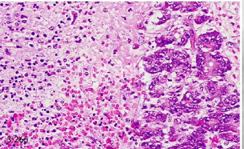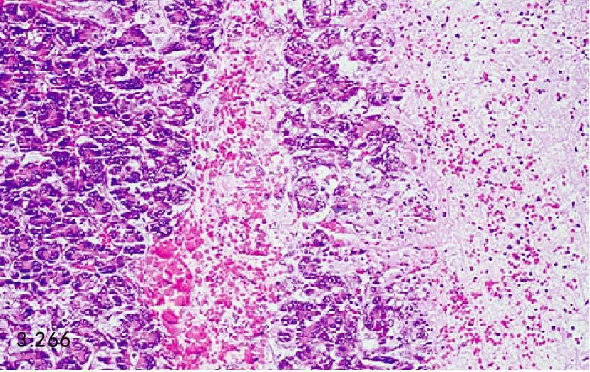 图3.265和图3.266 上图患犬胰腺的组织病理学图片显示为腺体坏死、出血、水肿,由中性粒细胞和巨嗜细胞的炎性浸润(H&E)。