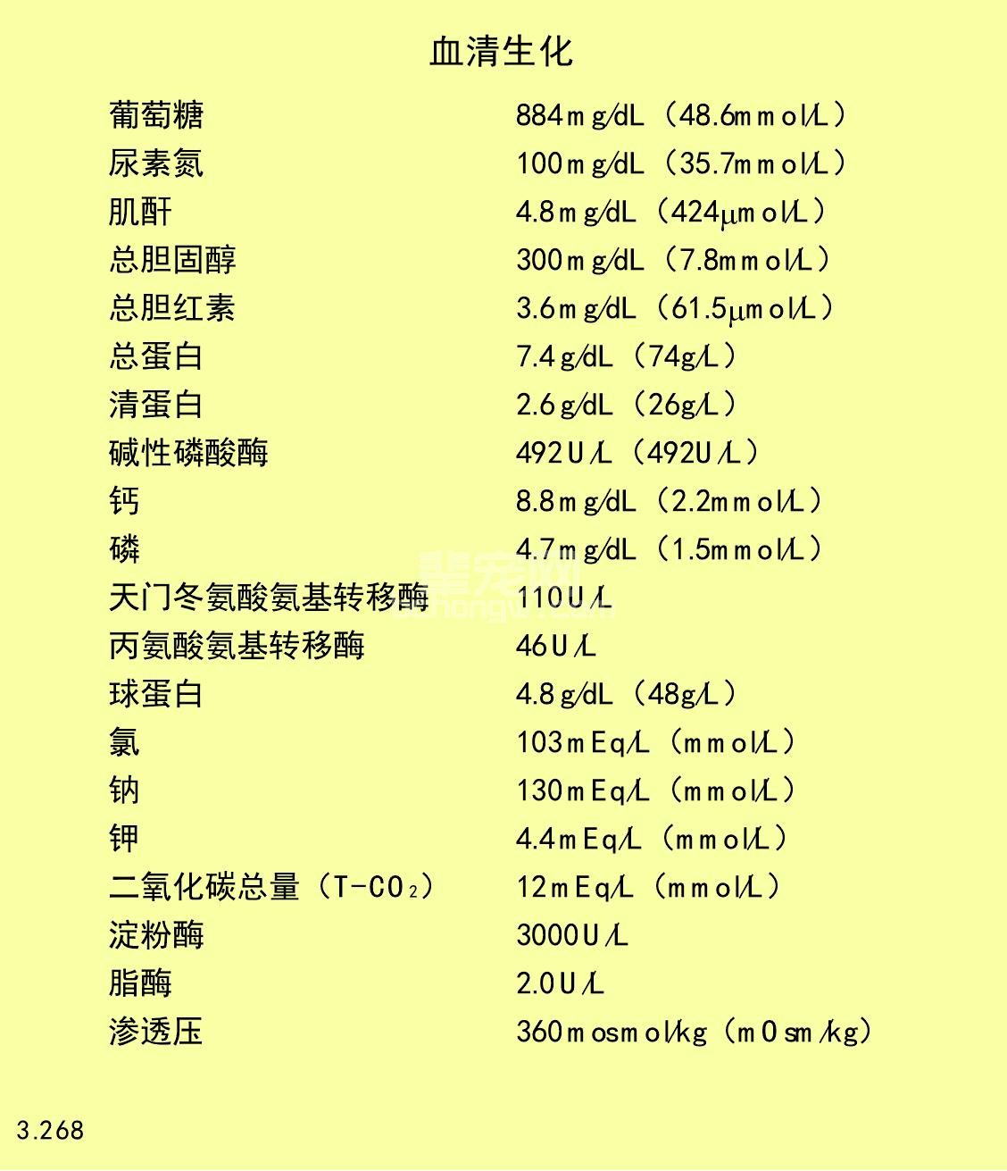 图3.268 图3.237中患犬的血液生化指标异常。这些血液生化指标支持了高渗透压性糖尿病性酮酸中毒和肾衰竭的诊断。血液淀粉酶和脂酶超过正常水平2倍以上,支持了急性胰腺炎的诊断。钙盐形成使血钙浓度降低。肝脂沉积和胆脂沉积使肝酶浓度升高,而低血钠可能由于肾小管钠吸收障碍,渗透压性多尿症和呕吐造成。高血脂或高血糖可能引起假性低血钠。总CO2浓度降低可能提示代谢性酸中毒,高血糖使渗透性升高。
