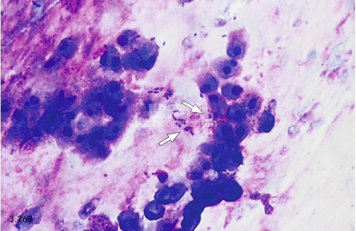 图3.269 急性胰腺炎手术的显示之一为胰腺蜂窝织炎和继发性细菌感染。此犬患有明显胰腺蜂窝织炎坏死和脓肿形成,取腹腔液检验其细胞。图中可见中毒性中性粒细胞中含有细菌,细胞外有游离细菌(箭头所指)。发生感染细菌培养时,多常见革兰阴性菌。