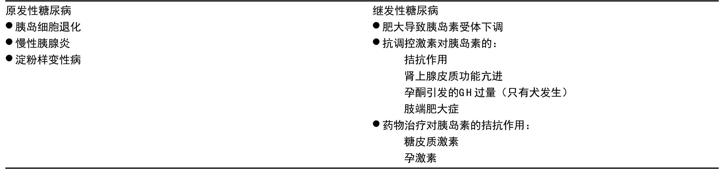 人糖尿病可分为1型胰岛素依赖性和2型非胰岛素依赖性糖尿病。而患有糖尿病的所有的犬无论病因如何,都需用胰岛素治疗,因此这种分类方法不适用于兽医临床,临床上犬糖尿病分为继发性和原发性(表4.23)。继发性中由对外周胰岛素的拮抗引起,最初会有胰岛素补充性升高,但一段时间后胰岛细胞耗尽,β细胞破坏,它的功能永久性丧失。