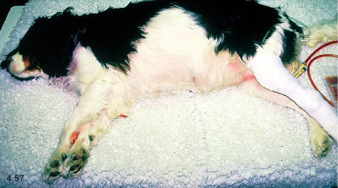 图4.57 3岁骑士查理士王猎犬因糖尿病酮酸中毒而休克。