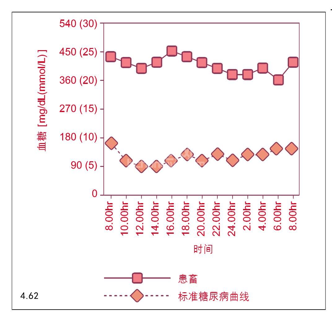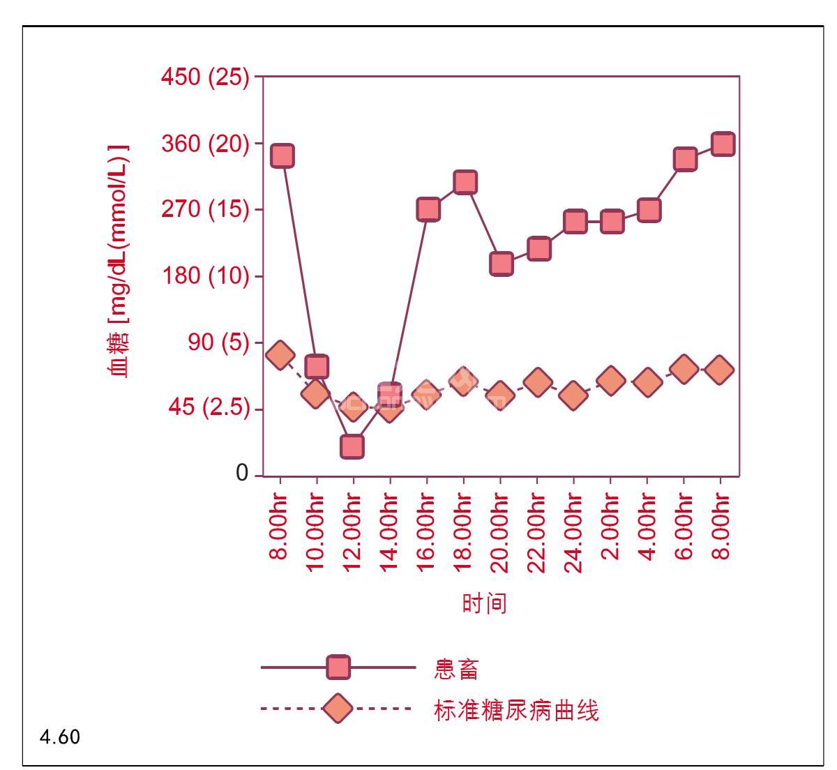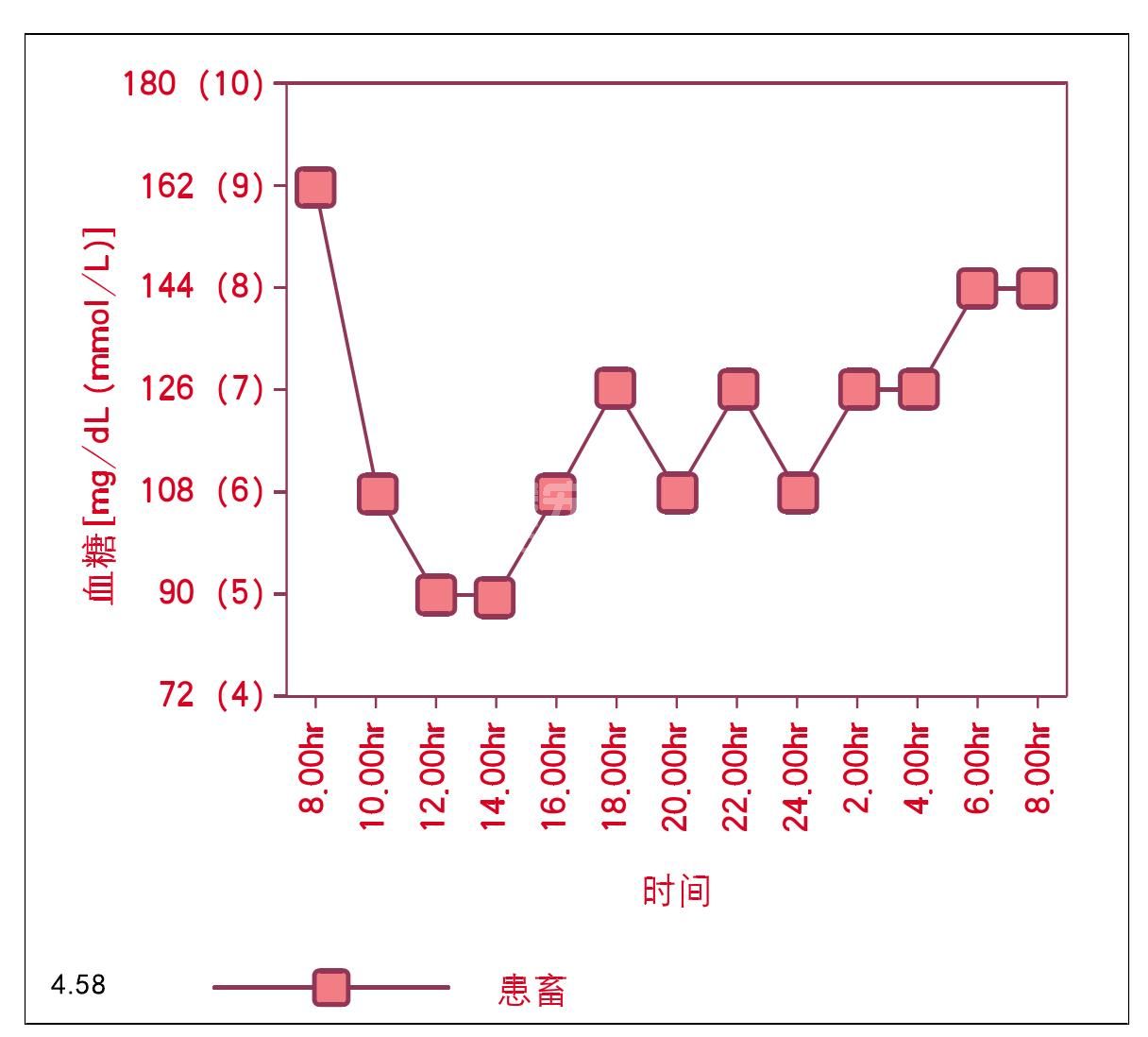 理想化的血糖浓度应保持在90~162mg/dL(5~9mmol/L)(图4.58)。血糖浓度在早晨注射胰岛素之前通常最高,而在第二次饲喂之前最低。早晨尿样中有葡萄糖的痕迹是可以接受的,但是在一天之中的其他时间尿样中不应有葡萄糖。然而,重要的是我们需记住尿中葡萄糖可能不能及时反映出同一时刻的血糖浓度。如果尿糖呈阳性,血糖浓度可能是低血糖 [小于54mg/dL(3.0mmol/L)] 正常血糖或者高血糖 [大于99mg/dL(5.5mmol/L)] 。尽管笔者的顾客定期测定尿中的葡萄糖和丙酮,但是它并不提倡在早晨测定尿糖的基础上调整每天胰岛素的用量。反之,除非动物有好几天无法保持稳定,可以坚持使用固定的胰岛素用量。
