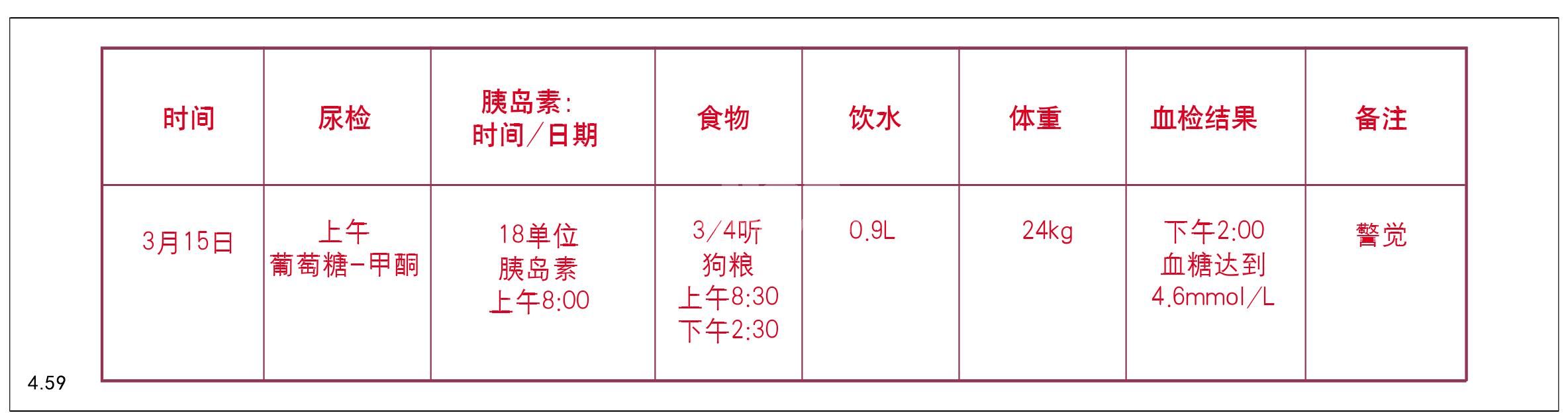 畜主应坚持做糖尿病的记录(图4.59),这样更容易评估一段时间内病情稳定情况。当受到感染、发情(特别是在整个发情周期的后期)、怀孕和丙酮