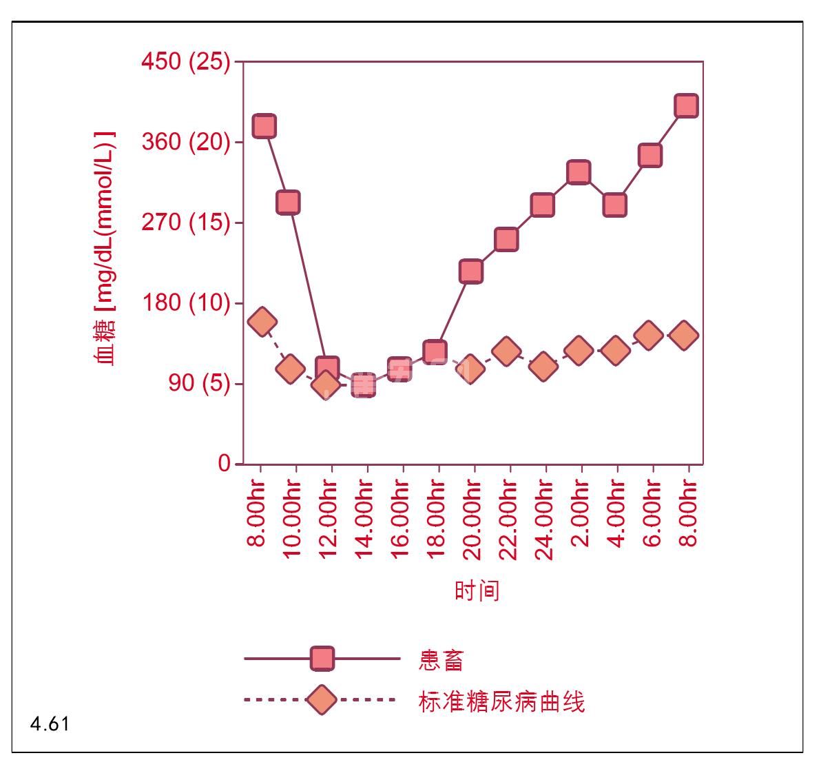不稳定的第二个原因是胰岛素快速代谢,也就是说间断性起作用的胰岛素制品不能持续24小时(图4.61)。在这些病例中,血糖浓度在早晨注射胰岛素之前高,但是一天中的多数时间降到正常浓度。然而第二次饲喂以后,血糖浓度上升,一天中剩下的时间也保持高水平。这导致长时间高血糖,引起早晨糖尿和夜间烦渴、多尿。因此,胰岛素快速代谢治疗要使用长效胰岛素制品,如糖蛋白锌胰岛素或超长效胰岛素;或间隔12小时注射两次长效胰岛素,配合4次小剂量饲喂(间隔大约6小时)。