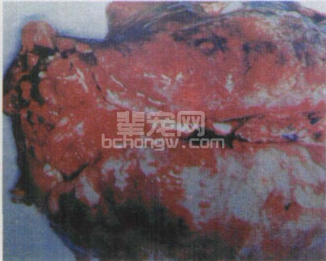 最急性型病猪表现为突然发病死亡或体温升高,呼吸极度困难,呈犬坐姿势,咽喉部红肿坚硬,可视粘膜发绀。切开咽喉部可见大量胶冻状淡黄色浆液。肺充血、出血、肿大(图15-1),全身淋巴结呈出血性炎症,心外膜、心包膜出血,脾出血但不肿大,胃肠粘膜出血。
