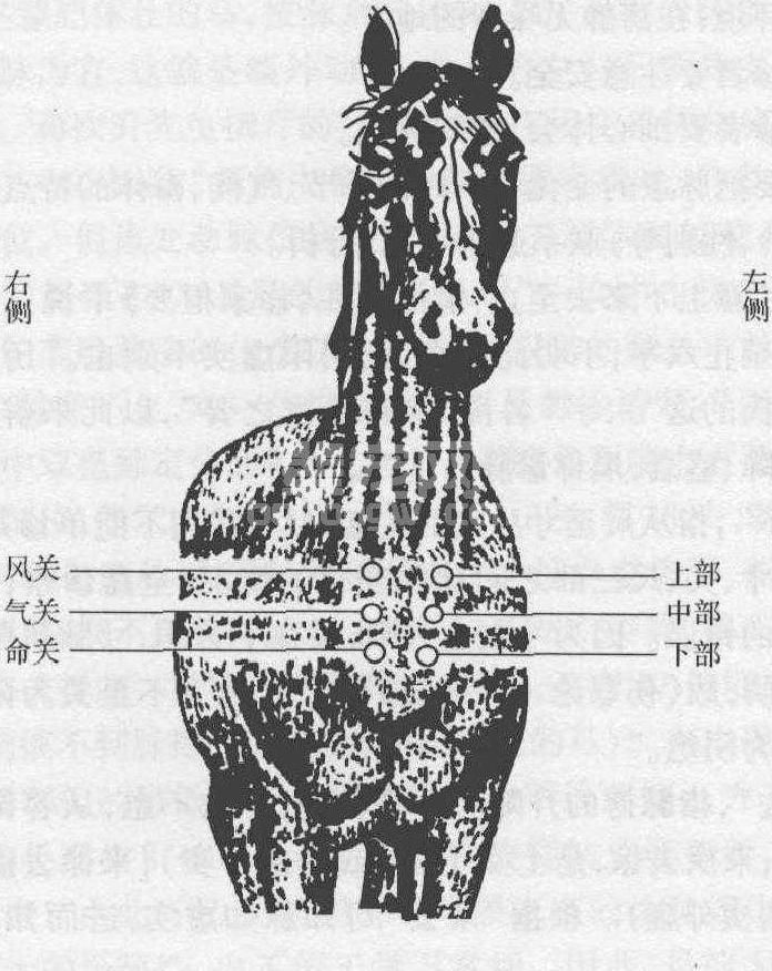 (4)双凫脉六部分候脏腑的意义:《元亨疗马集·脉色论》指出,左凫上部候心和小肠经脉,中部候肝、胆经脉,下部候肾和膀胱经脉;右凫风关候肺和大肠经脉,气关候脾和胃之经脉,命关候三焦和命门之脉即每一点代表一脏一腑。那么,从这六部脉象的变化,可推知何脏何腑有病。这种方法沿用至今,有些学者对这种分法的科学性和实用性产生了疑问。