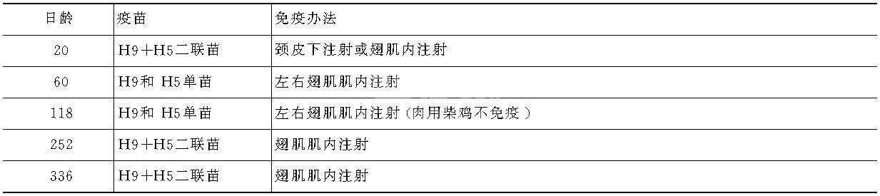 (4)免疫反应监测:对于新城疫病毒一般采用HI试验评定免疫反应。易感禽缓发型弱毒疫苗一次免疫后,免疫效价可达24~26。油乳剂灭活疫苗免疫后HI效价可达211或更高。①认真做好疫苗免疫接种工作。目前此病仍无特效药物治疗,只能靠疫苗主动免疫产生抗体。在免疫时要特别注意上述几个引发原因,根据实际制定符合本地切实可行的免疫程序,选用适当、可靠疫苗,采取正确方法和足够剂量免疫。②加强饲养管理,做好防疫消毒和清洁卫生工作。饲养栏舍最好远离人畜繁杂的地方,进栏前和每批鸡出栏后均应进行严格彻底清洗消毒,每栋栏舍均使用专用器械和用具,工作人员穿戴消毒过的专用衣服和鞋帽,不让外人进入。③采取全进全出的办法,杜绝一栋栏舍同时养几批不同日龄的鸡。④一经诊断发生本病时,首先应将病死鸡作无害化处理,挑出病鸡隔离,对未出现症状的鸡群可选择如下两种方法治疗:第一种是在饮水和饲料中加入抗病毒中草药,交叉补充多种维生素,特别是维生素C。第二种是紧急接种疫苗,20日龄以内的鸡最好用Ⅱ系或Ⅳ系疫苗作4倍稀释。预防新城疫的免疫程序见表8.4。