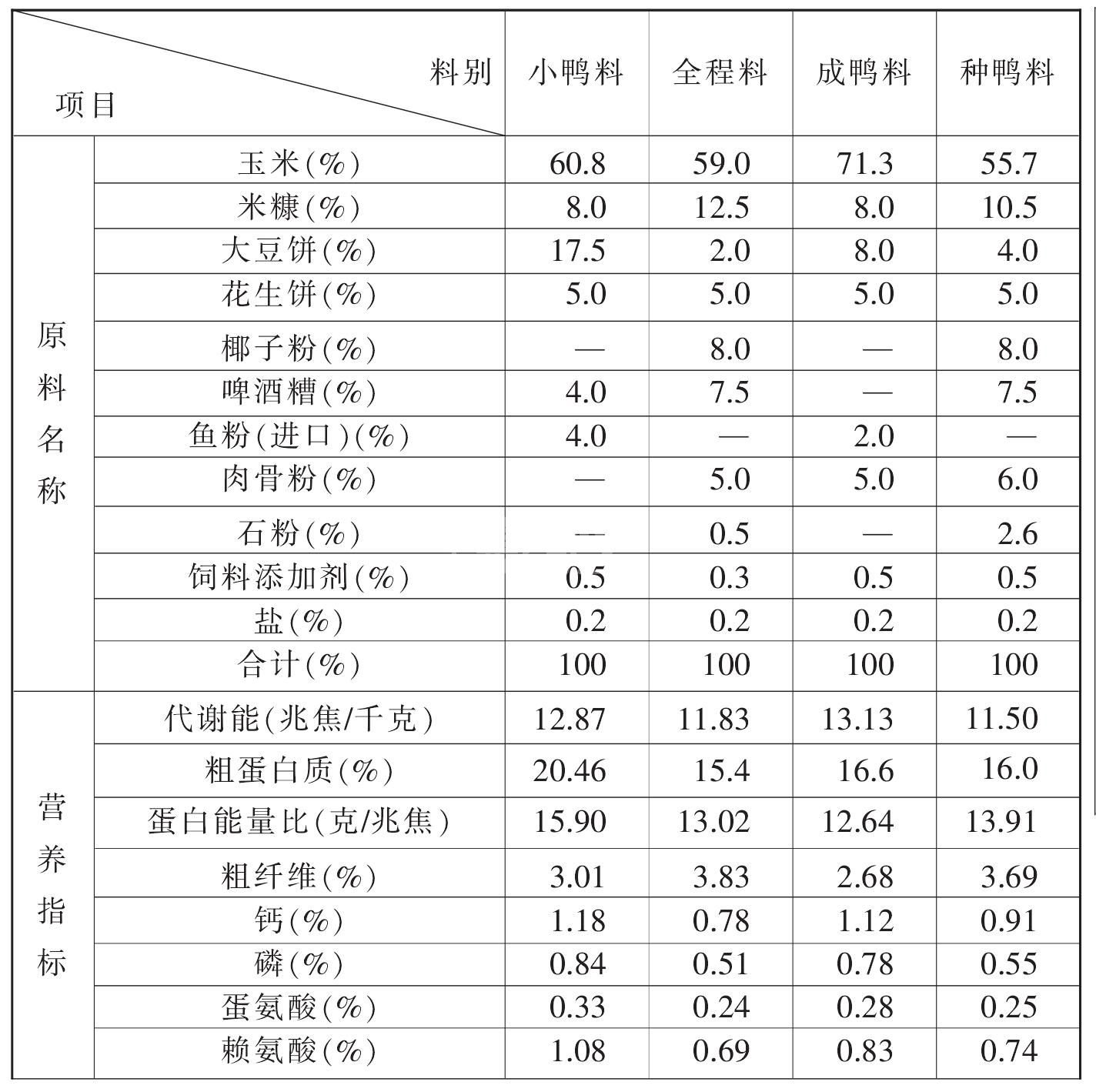 主要根据不同季节和牧地草生情况,决定鸭群圈养与放牧时间。一般在春季整地、夏收夏种、秋收秋种三个时期以放牧为主,晚上收牧归圈后补喂1次配合饲料,其他时间一律进行圈养,其日粮配方如表14所示。