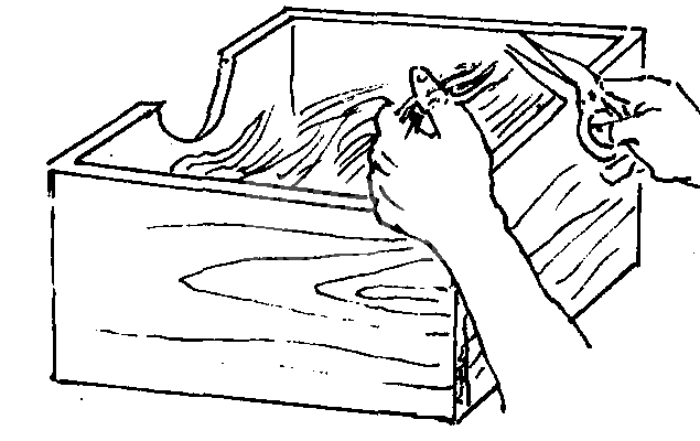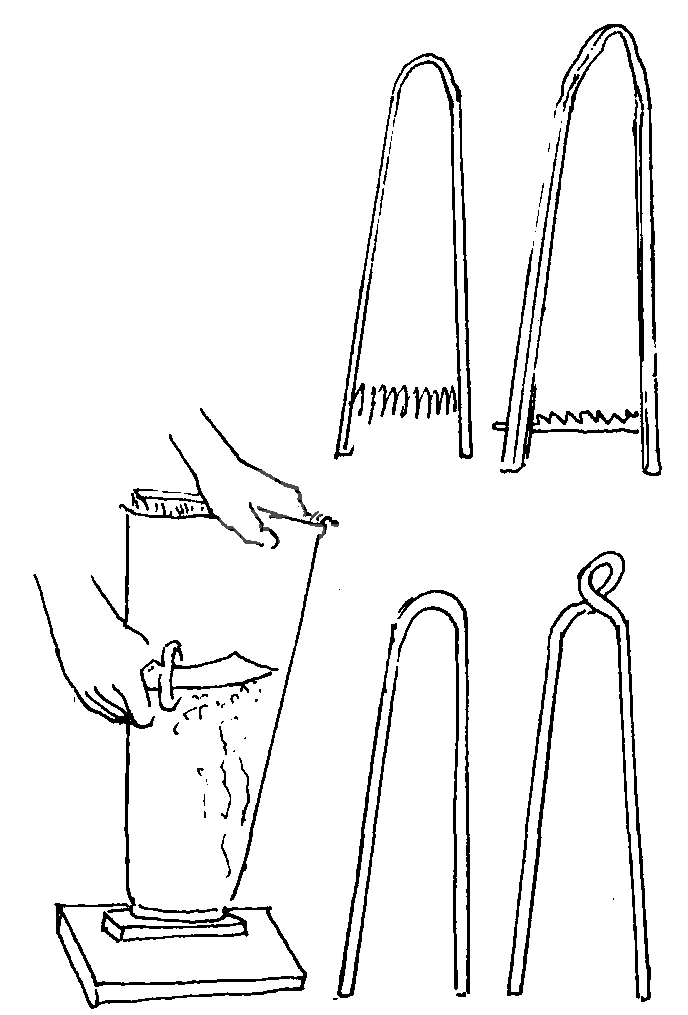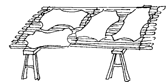 (5) 兔皮撑子的制作方法。兔皮撑子一般用8号铅丝和宽2~2.5厘米、长130~150厘米的竹片或楔形木板制作。用竹片制作皮撑时,先将竹片四角棱刮光不留结节和竹刺,之后,再将竹片放温水中浸一浸,而后用麦秸火将竹片中间烤热,自中间将竹片弯成“∩” 形,两头用绳子拉住,即呈撑皮架。晾干的兔皮要板对板、毛对毛摆放叠好,放些樟脑丸,在通风干燥处保管。