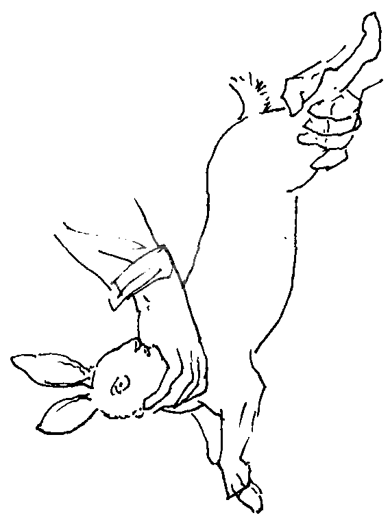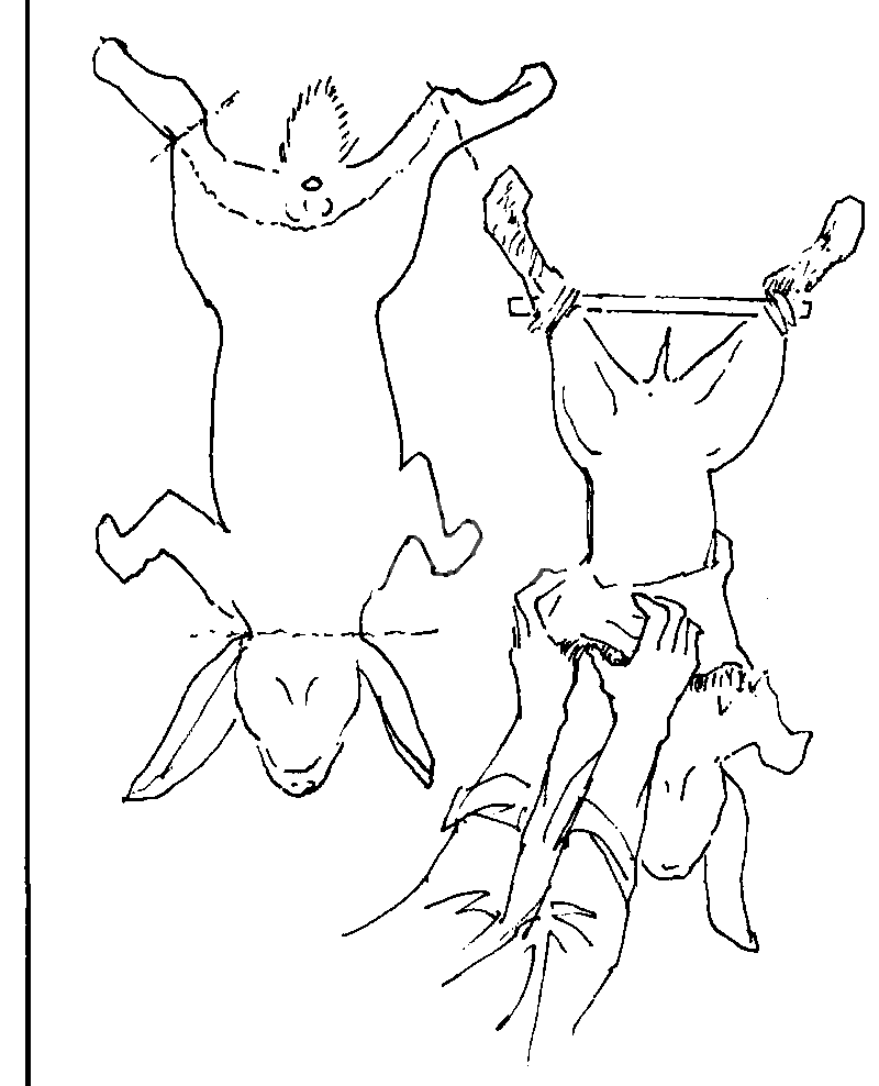 (4) 獭兔皮的取皮方法。取皮时,要掌握不使兔皮穿孔受伤和污染的原则。要先用棒击、电击、静脉注气或颈椎错位等方法将兔处死后再剥皮。剥皮方法是将兔的后右腿用绳子或铁丝拴起倒挂在剥皮架或树叉上,割去尾巴后,用剥刀沿左腿飞节处朝右腿飞节处,沿大腿内侧、阴部上方呈直线捅开,横切飞节处腿皮,两腿皮翻过臀部之后,用力将整个皮筒拉下,到颈部耳根处将皮筒与头部分割,即呈毛朝里,皮朝外的筒皮,用撑皮架脖朝上、臀朝下支撑好,挂在阴凉通风处晾干即可。若剥板皮时,可在皮筒拉到颈处后与头部分割前,沿兔下颌朝腹部中线切开,而后捅开前肢皮孔即呈长方形板皮。剥下的板皮要自然伸开铺在专用的晾皮板上,将四角四周用小钉钉好,放阴凉通风处晾干。