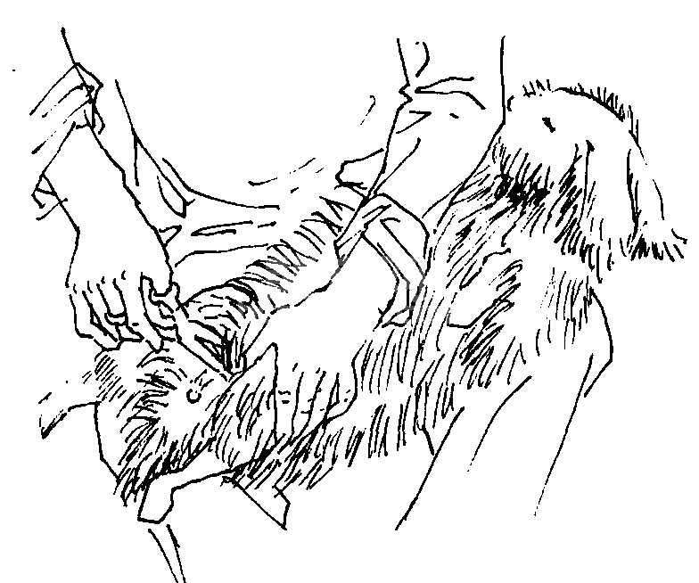 ⑤取皮时要保持皮毛清洁,无污染和血迹。如剥板皮,要割头去尾,沿腹部中线割开,注意不要割斜割偏,否则将降低质量等级。