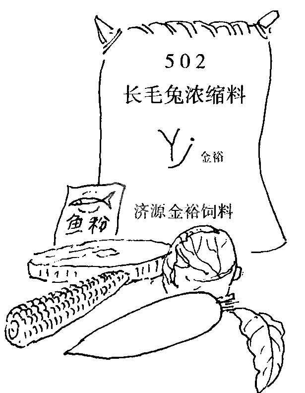 (4) 长毛兔的饲料营养要丰富。含硫氨基酸 (蛋氨酸和胱氨酸)、豆饼、鱼粉、玉米等蛋白质饲料含量要高,剪毛后第一个月蛋白质含量在17%以上,2~3个月在16%以上。