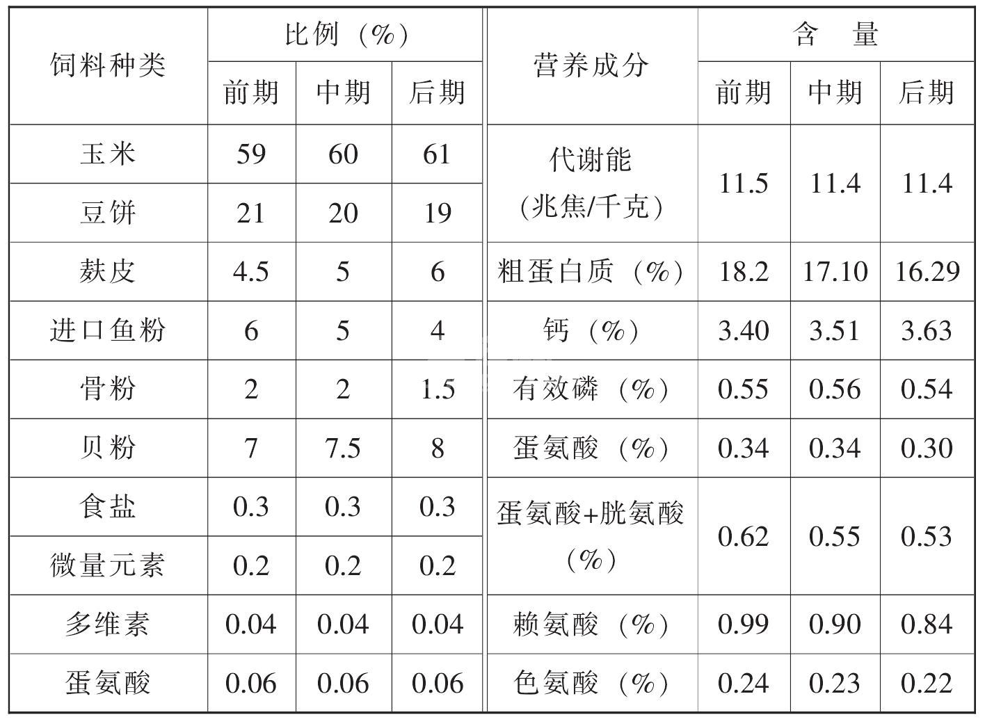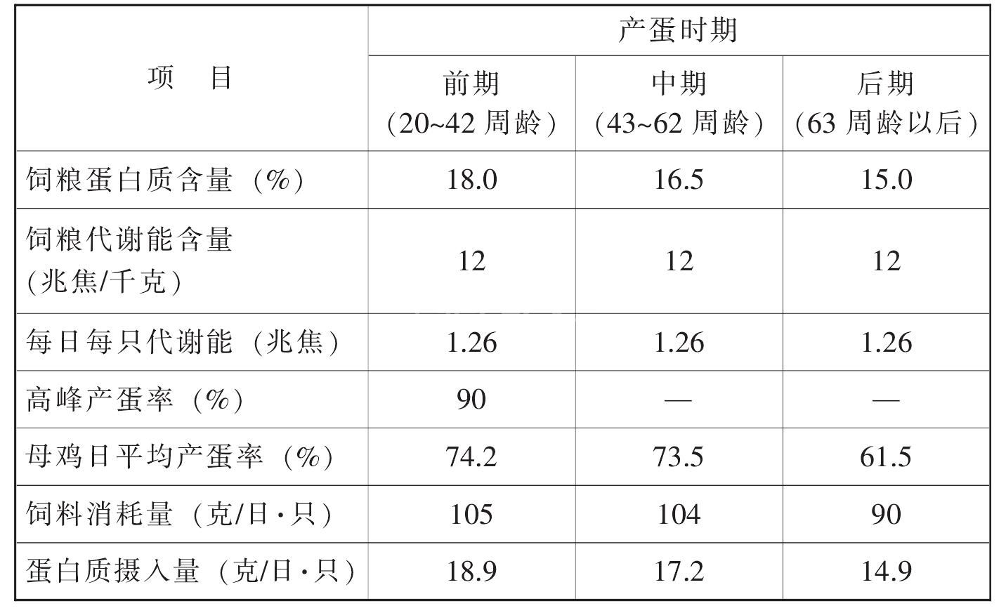 ①两阶段饲养法按鸡群产蛋周龄并结合产蛋率的升降变化分产蛋前期和产蛋后期,即从鸡群开产(鸡群产蛋率达5%)至产蛋高峰期(鸡群产蛋率达85%)过后为产蛋前期,产蛋过后至鸡群淘汰这段时期为产蛋后期。两段饲粮营养水平及饲粮配方见附录一(我国蛋鸡饲养标准)和附录二(典型饲粮配方)。