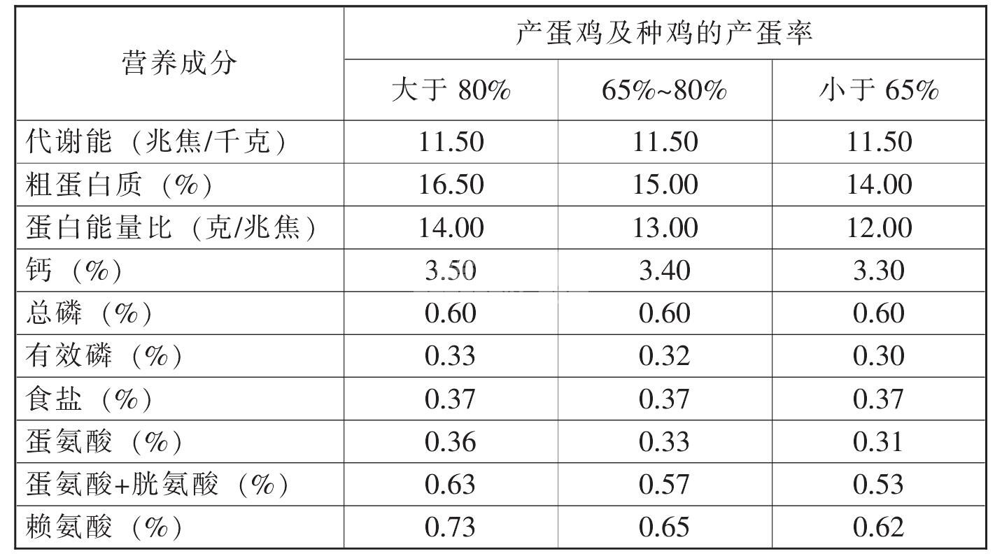 表16 产蛋期蛋用鸡及种母鸡主要营养成分的需要量