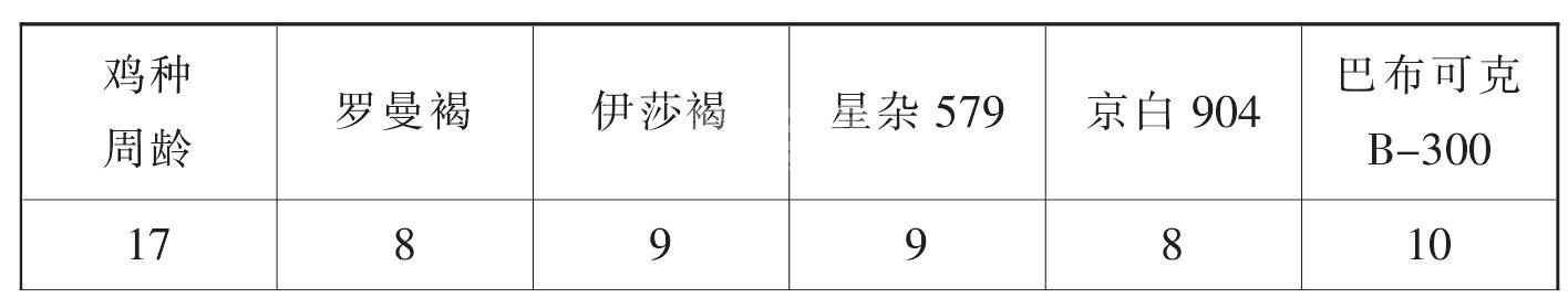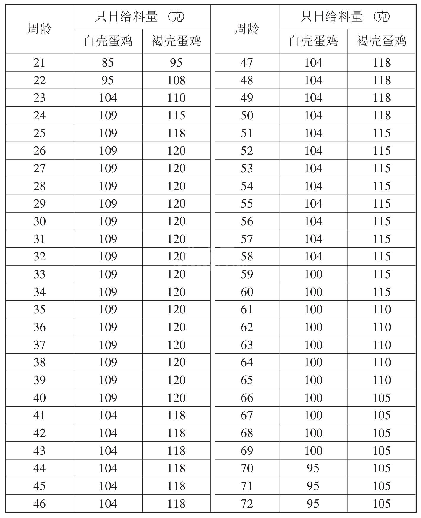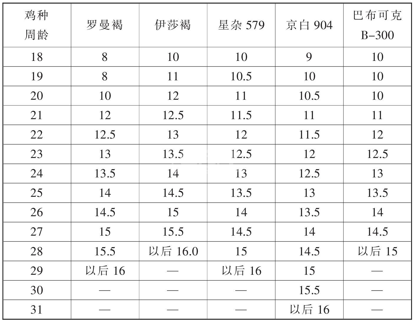 白壳蛋鸡和褐壳蛋鸡只日大致给料量见表17。