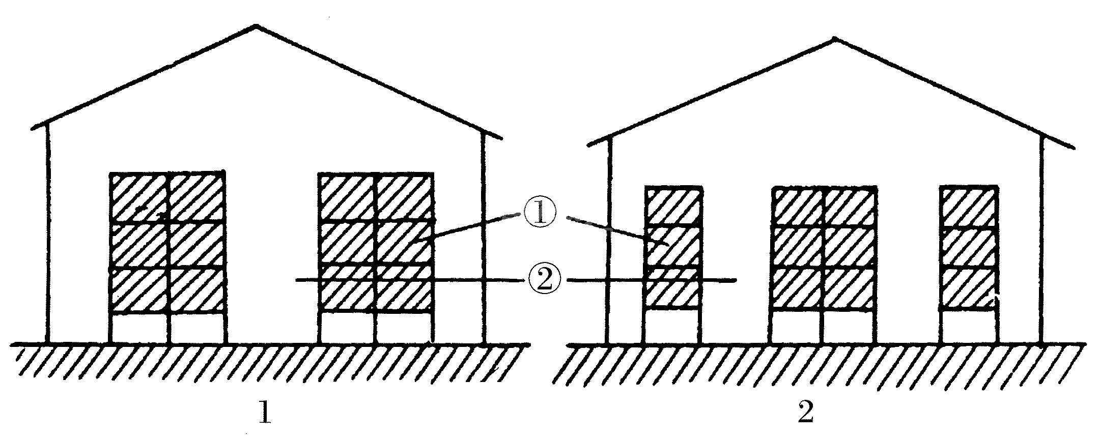 双笼式鸽舍:也称中山式鸽舍(图2)。在广东省的中山、珠海等地较多见。结构特点是,在鸽舍内紧靠墙壁安装两列鸽笼,在每列笼墙外面紧靠墙壁也安装两列鸽笼,内外笼相通。鸽舍长20~30米,宽3米,脊高3~3.4米,墙高约2米,屋顶采用人字屋架,并做成钟楼式。