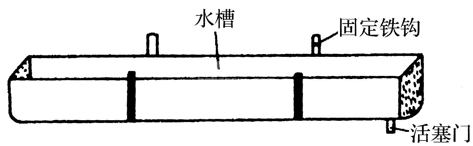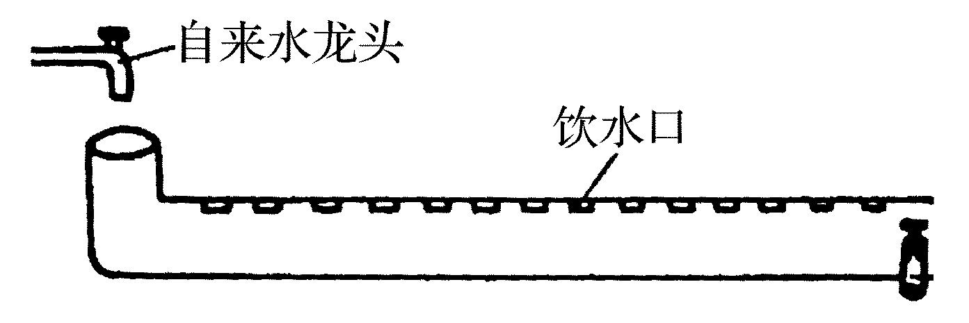 开口式塑料水槽适于各种大、中、小型鸽场及专业户,也适于家庭养鸽。其结构是一条上方开口的“U”形水槽,槽口宽8~10厘米,深约10厘米,两边高8~9厘米,底面成弧形。水槽长度根据鸽笼的行长决定,水槽一头的封口带有流水活塞,便于在水加至水槽八成高时能自动流水和清洗水槽时流出污水(图11)。这种水槽一般用于单列鸽笼,也可用于双列鸽笼。用于单列鸽笼时,将水槽放在笼的背面,上面用纤维板斜盖住,防止粪便污染;用于双列鸽笼时,可与尼龙编制布饲槽联合安装。这种水槽的优点是能进行流水式作业,便于换水和清洗,工作方便,价格较便宜。但装配不当,容易污染饮水。